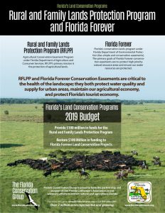 RFLPP and Florida Forever Conservation Easements are critical to the health of the landscape; they both protect water quality and supply for urban areas, maintain our agricultural economy, and protect Florida’s tourist economy.