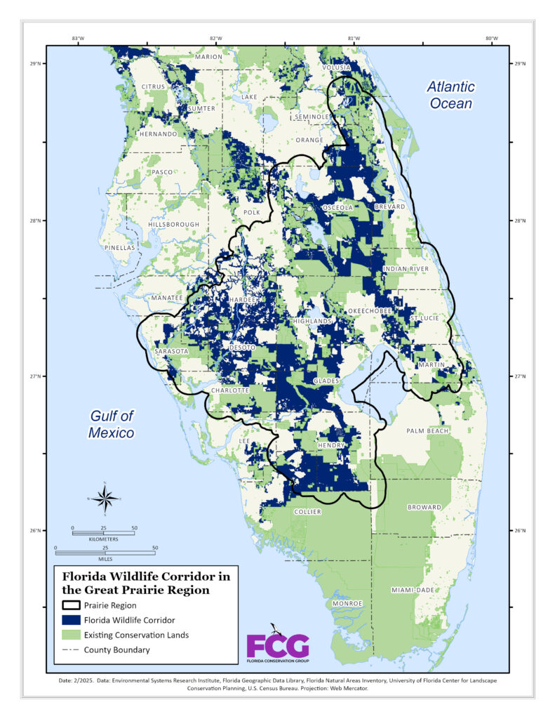 South-central and southwest Florida are home to the “Great Florida Prairie”, a vast grassland landscape. This includes the Florida dry prairie ecosystem– native upland grasses, palmettos, and scattered shrubs dominating a regional landscape that also contains wet prairies and marshes, hammocks, pine flatwoods, patches of scrub, and forested wetlands. The Great Florida Prairie is home to many unique species found nowhere else including the Florida grasshopper sparrow, Audubon’s crested caracara, Florida sandhill crane, Florida burrowing owl, southeastern American kestrel, and many other federal and state listed species or species of concern. The ranchlands of the Great Florida Prairie maintain the historical open land uses and grassland systems that support these species as well as providing a vast connected landscape that is the heart of the Florida Wildlife Corridor. The region is also an essential part of the Everglades, Charlotte Harbor, and St. Johns River watersheds, which cover approximately 60 percent of the watershed area of our state. Without these ranches, most of the remaining open prairie lands of south-central and southwest Florida would be lost to development that would destroy this unique habitat — as well as negatively impact our water resources. FCG is dedicated towards working with ranchers to protect the ranchlands that comprise the Great Florida Prairie.