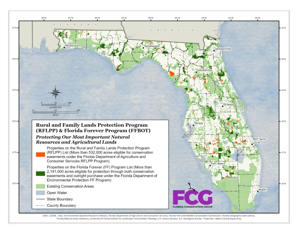 Properties marked in red on this map are eligible for permanent protection under the Rural and Family Lands Protection Program (RFLPP). There are over 500,000 acres on the list that can be protected under an agricultural conservation easement with the RFLPP program. Properties marked in green are eligible for permanent protection under the Florida Forever Program. These properties represent over 2000 million acres that are eligible for protection via outright purchase and with conservation easements. Together these programs protect Florida’s water, wildlife and agriculture.
